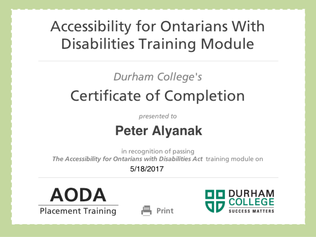 AODA Certificate in recognition of passing The Accessibility for Ontarians with Disabilities Act training module.