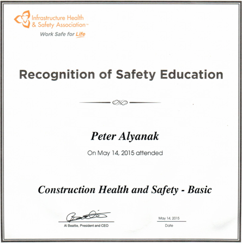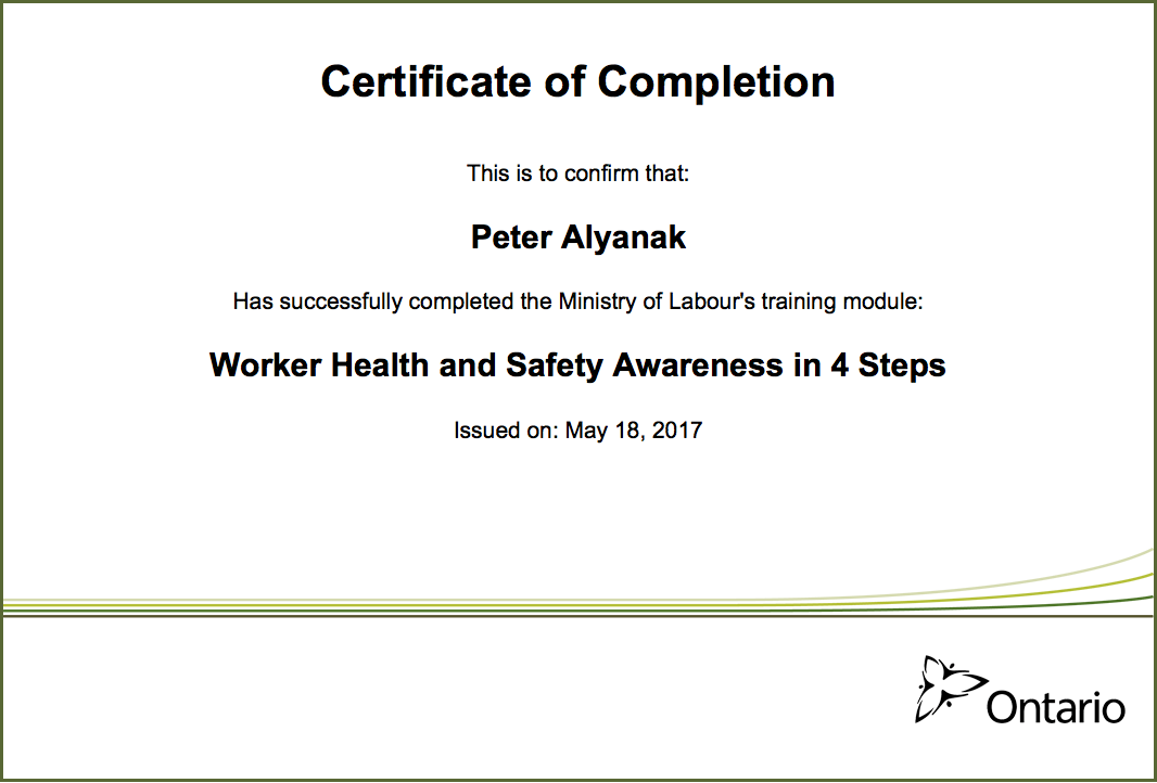 H & S Certificate in recognition of passing the Ministry of Labour's Worker Health and Safety Awareness training module.