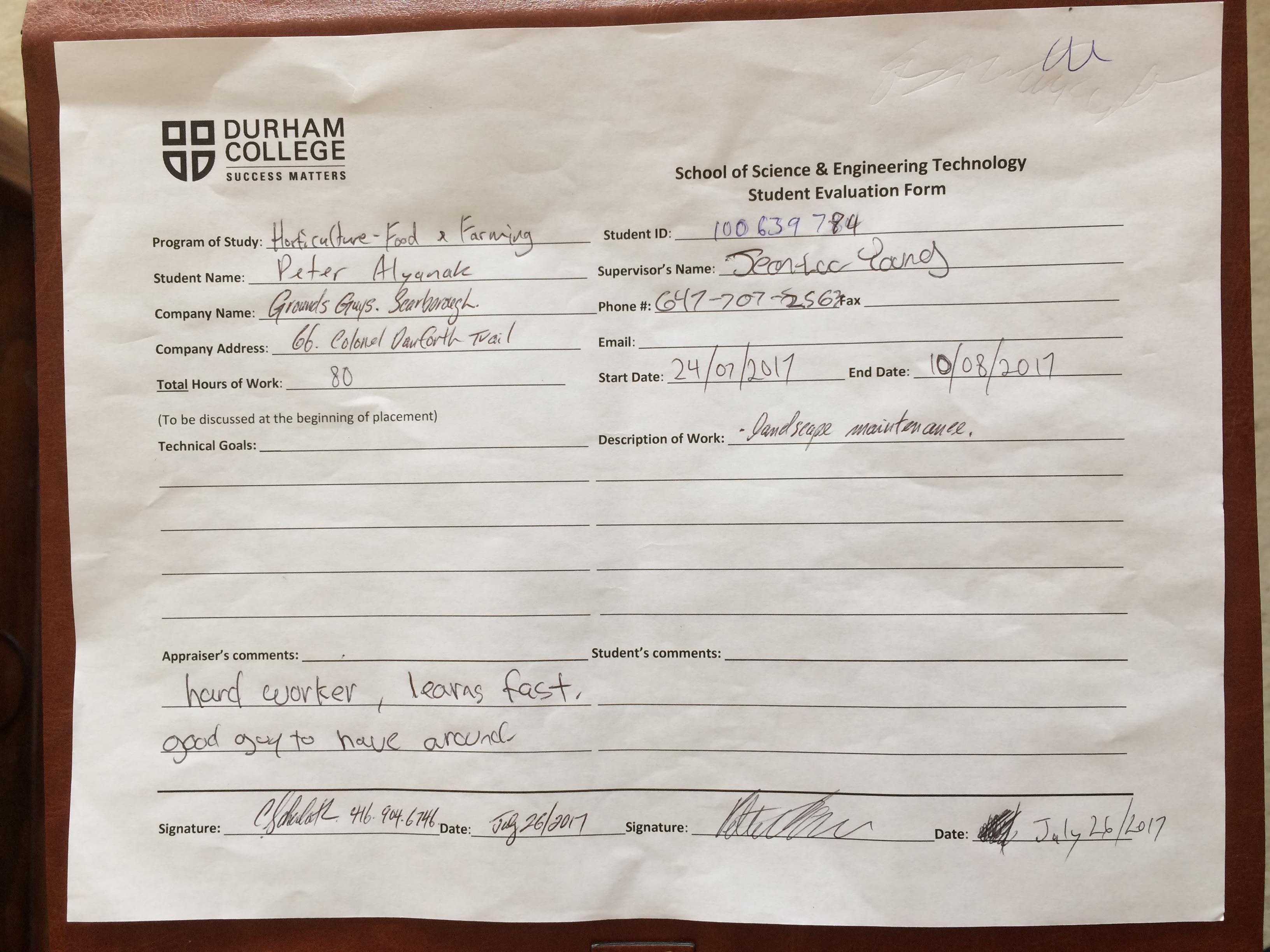 Placement Evaluation Comments from the owner of "TheGroundsGuys" regarding my work ethic.