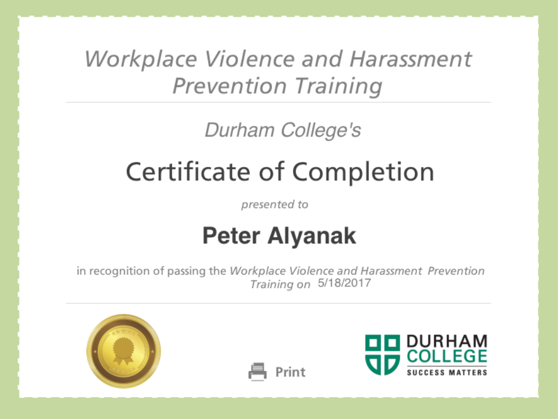 VHW Certificate in recognition of passing the Workplace Violence and Harassment Prevention training.