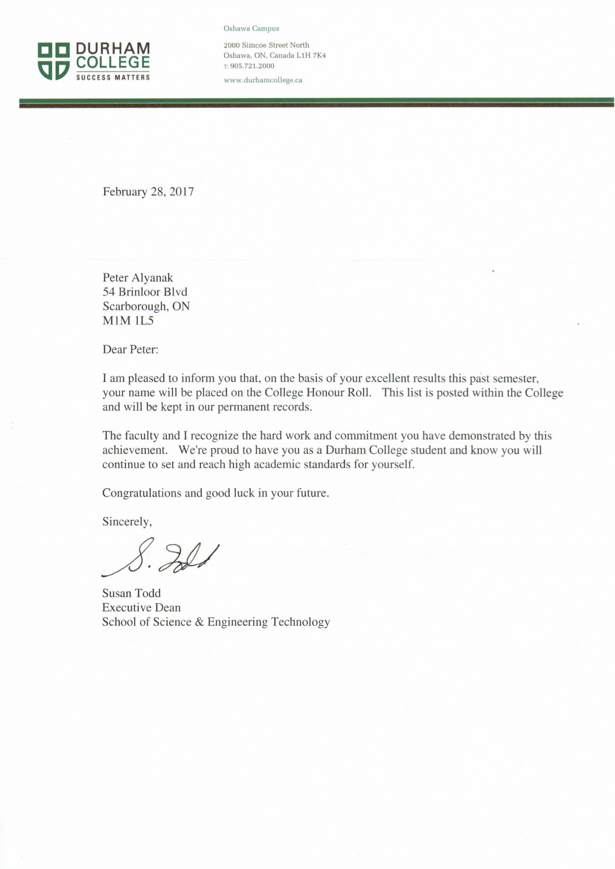 Honour Roll Letter sent by the Executive Dean of Durham College's School of Science and Engineering Technology congratulating me on making the honour roll.